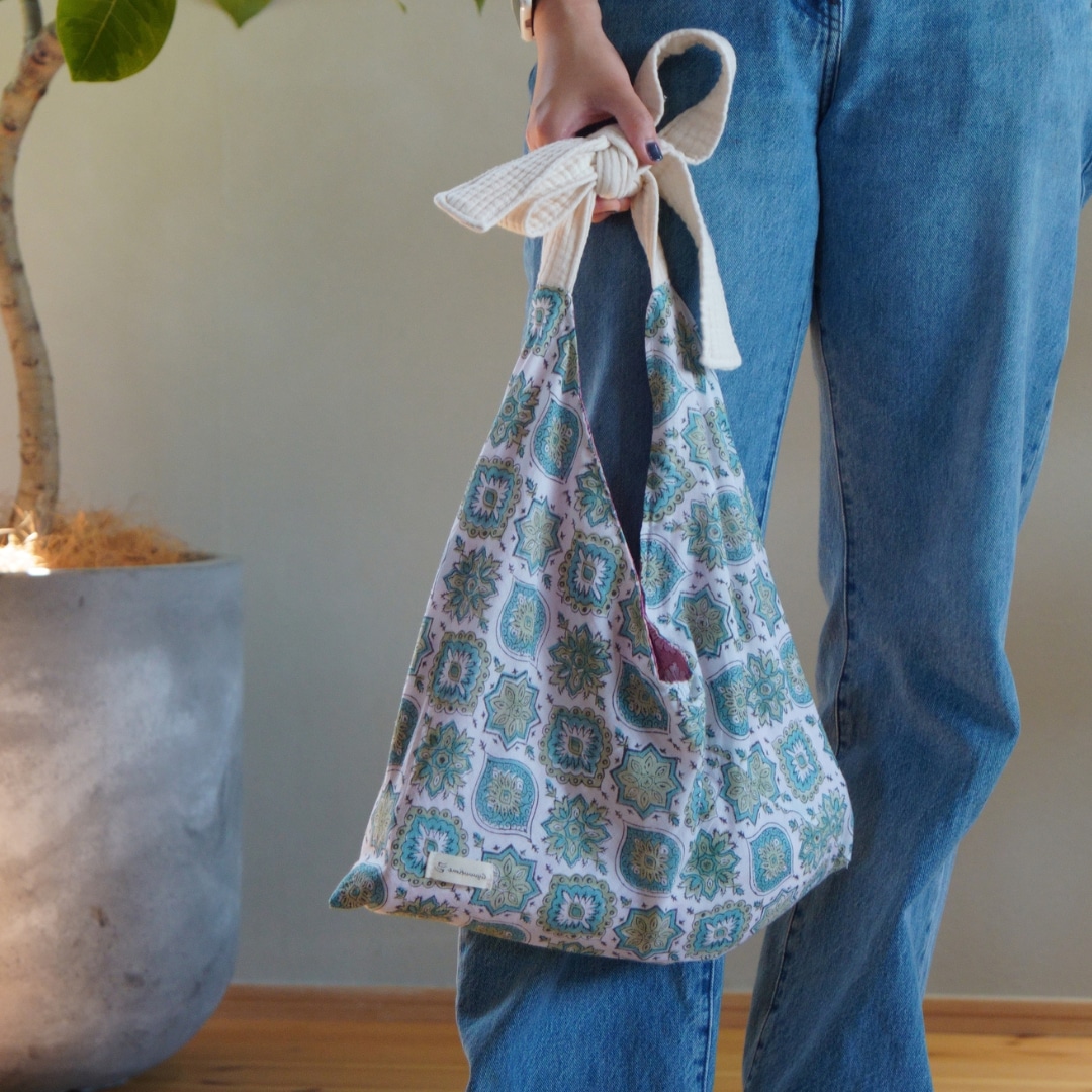 このバッグ、実はベビーブランケットを作るときに出る“余白(端切れ)”から生まれたバッグなんです。